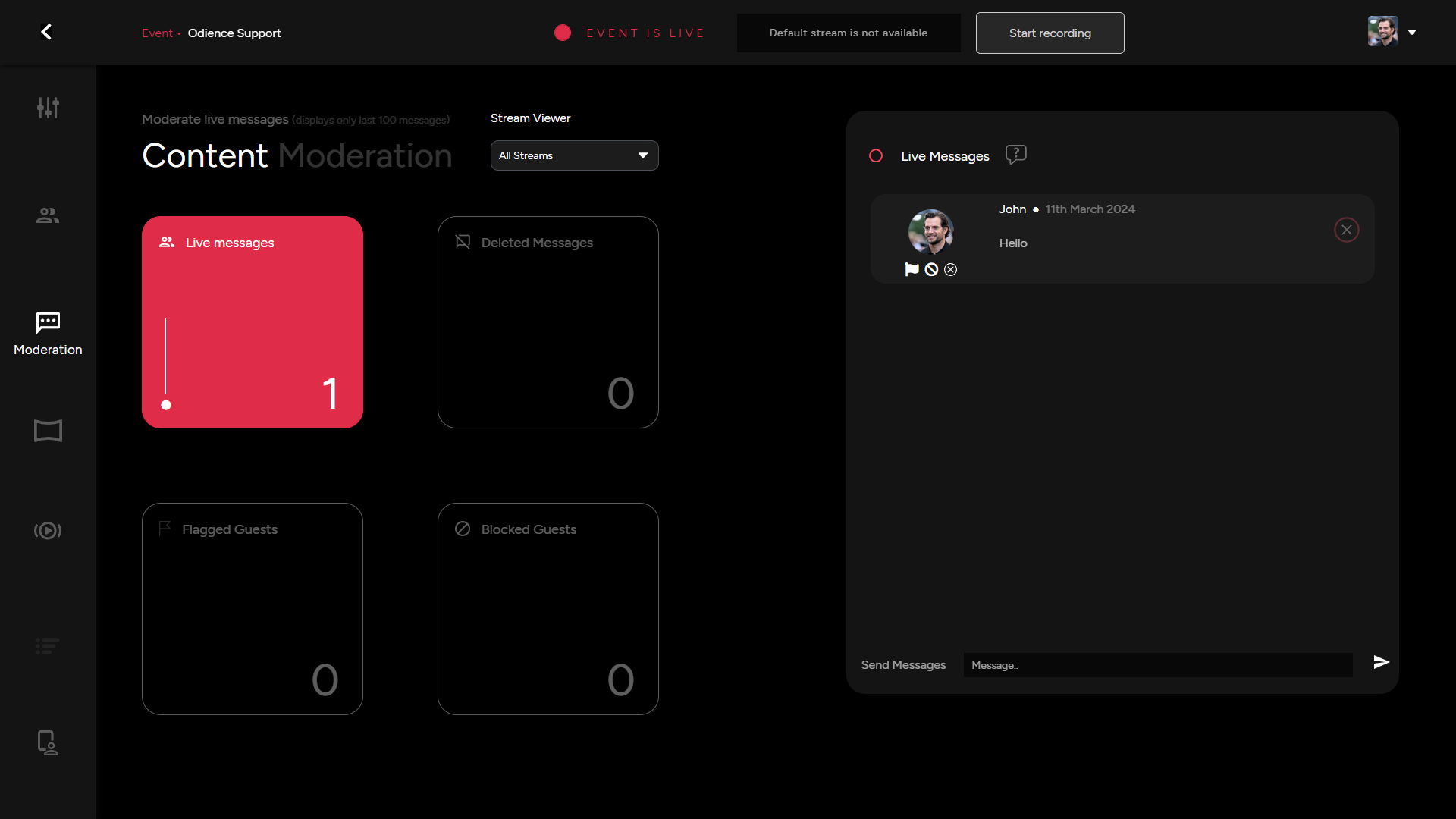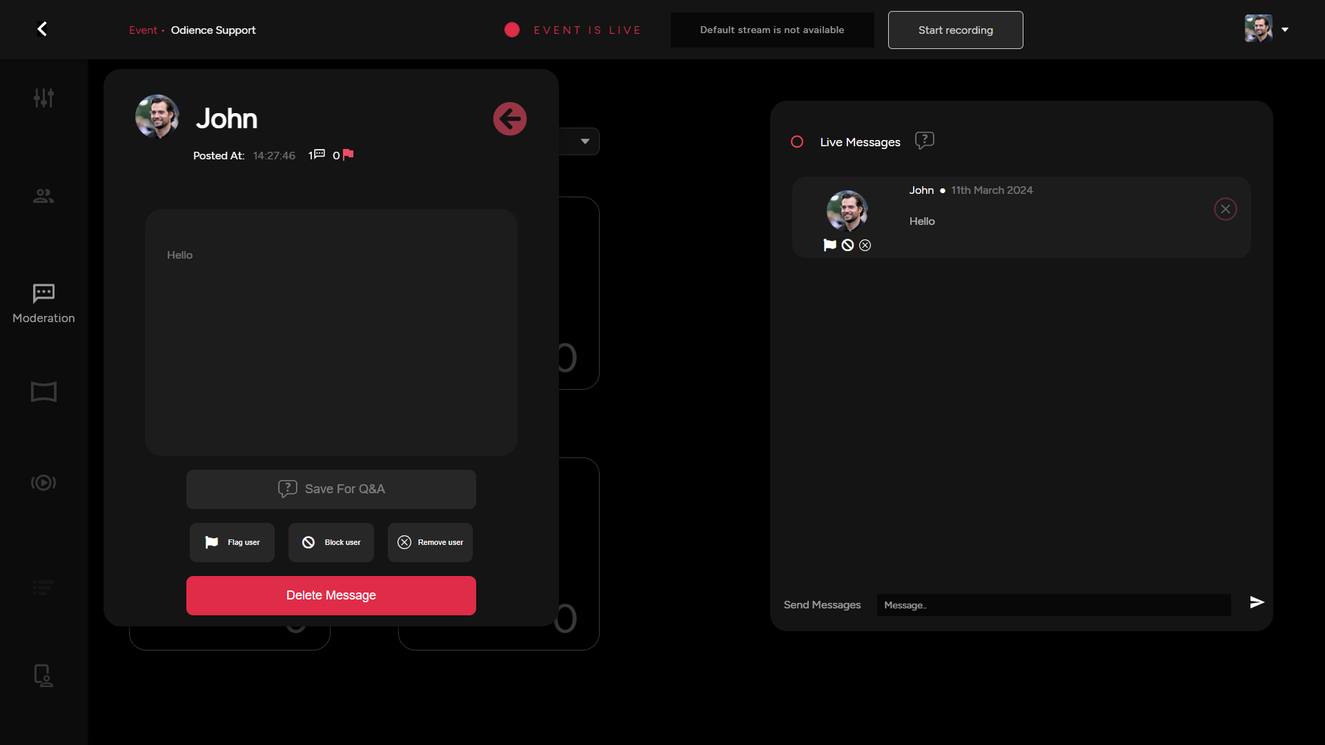 Manage the live messages running through the chat. Delete messages, flag guests, block guests or save messages to reference later in your event for a Q&A session.