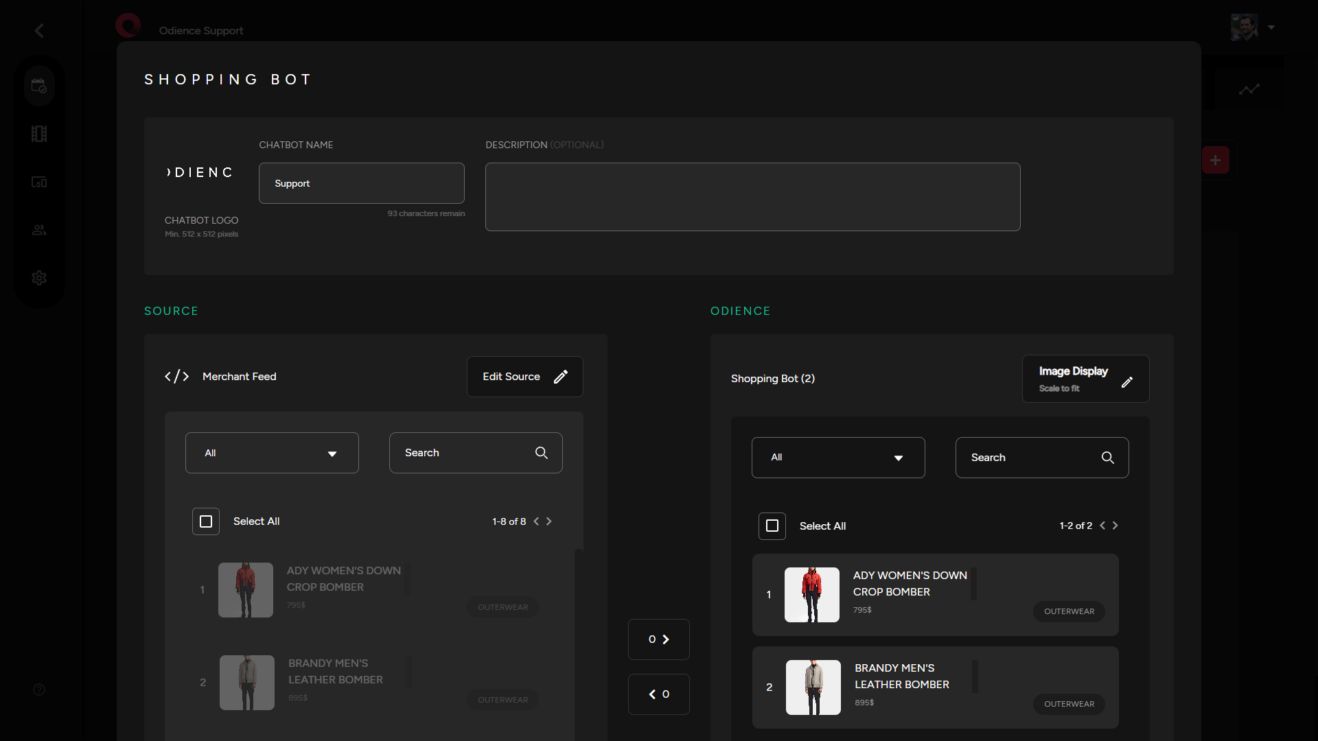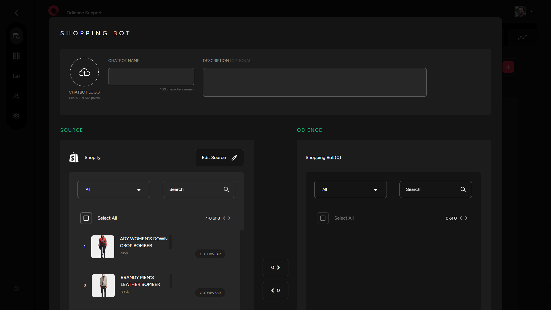 6. Add a Chatbot Logo, Name, Description (optional) & then select which products from your source you want to include in your Odience shopping chatbot.