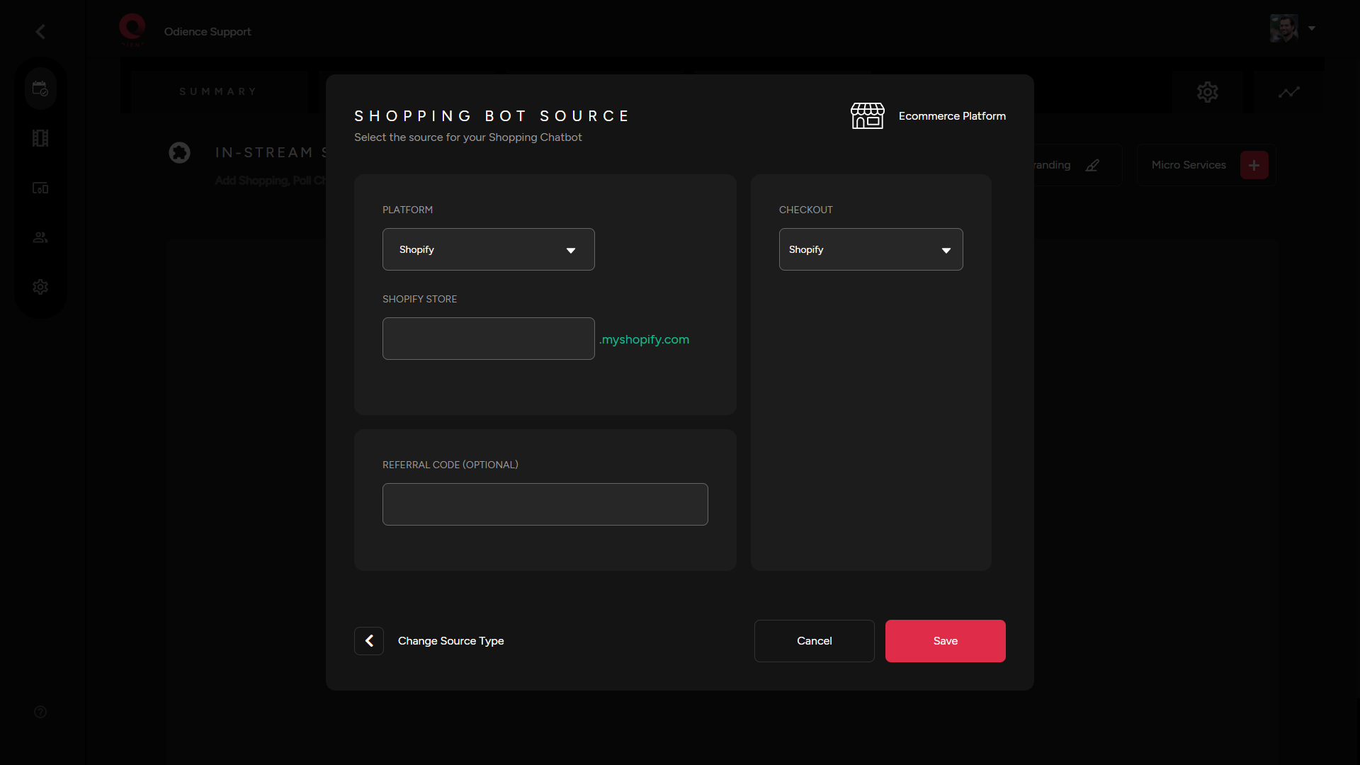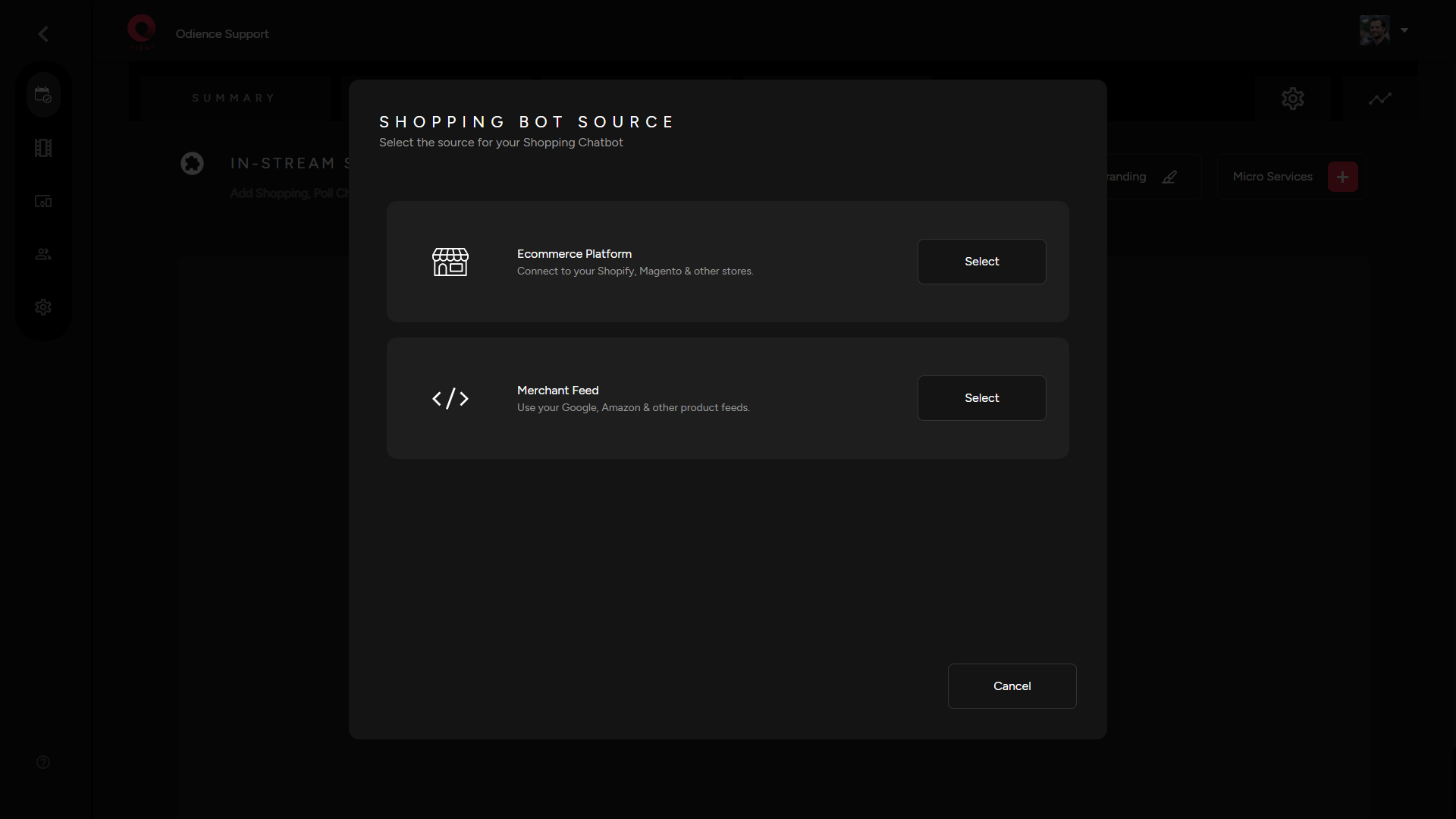 1. Select Shopping in your Quick Start or by selecting Add Chatbot in your Micro Services dropdown.